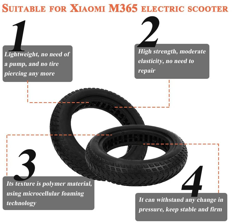 Nove gume (otporne na bušenje) za električni trotinet.  Dimenzija gume je 8.5×2 (odgovara raznim modelima trotineta: Xiaomi m365, Ring, Xplorer, MS Energy…). Gume se koriste bez unutrašnje gume. Ne pumpaju se.  Poseduju komore u vidu rupa koje apsorbuju neravine na putu. Vožnju čine udobnom a nemate strah od bušenja guma. Nisu plastične, imaju zaobljene ivice.